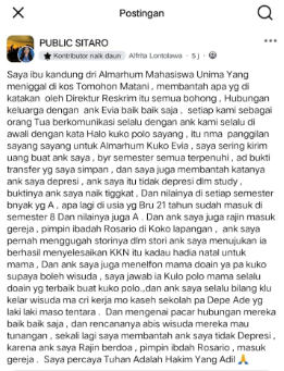 “Benar, unggahan itu dibuat oleh ibu almarhumah Evia. Itu adalah respons langsung atas pernyataan Polda Sulut terkait hasil penyelidikan sementara,” ujar Niczem.