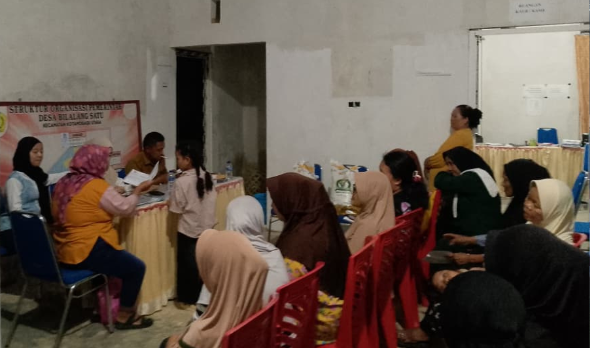 Bantuan berupa 6.840 kilogram beras dan 1.368 liter minyak goreng untuk periode Februari dan Maret 2026 ini disalurkan di Kantor Desa Bilalang Satu dan diterima langsung oleh warga.